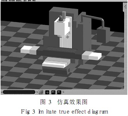 圖形顯示模塊主要負(fù)責(zé)刀具、夾具和主軸的繪制工作,而數(shù)據(jù)處理則是負(fù)責(zé)插補運算和刀具切削軸的計算,實現(xiàn)了數(shù)據(jù)和顯示分離,具有較好的模塊性. 仿真效果如圖 3所示.
