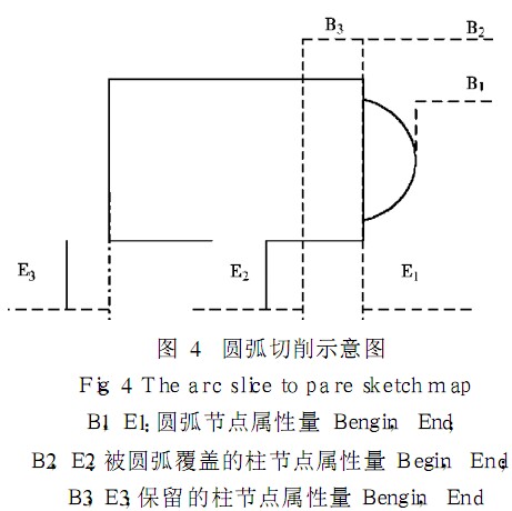 為了得到連續(xù)、動態(tài)的切削效果,屏幕畫面必須不斷刷新. 由于是可旋轉(zhuǎn)的三維圖像,每次刷新時僅將切削處重畫是不行的,必須將整根軸重畫.但如果將整根軸完全重畫,計算量大、耗時長、效率低,為此,利用了顯示表對切削過程的模擬進行優(yōu)化. 在上面提到的軸節(jié)點中,有一G l u n i t 類型屬性量i n d e x ,即是該節(jié)點的顯示表. 這樣,該節(jié)軸在沒有變化之前,程序里實際上只畫了一次,即將繪圖命令執(zhí)行結(jié)果存儲在緩存中,以后每次顯示時只需執(zhí)行g l C a l l L i s t ( i n d e x ) 即可. 由于采用了面向?qū)ο蟮牧斜斫Y(jié)構(gòu),整根軸的顯示可以轉(zhuǎn)化為列表的遍歷,依次調(diào)用每個節(jié)點的顯示表,迅速完成圖形顯示. 而且,復(fù)雜的切削過程也轉(zhuǎn)化為對列表和各個節(jié)點的操作,如在某段柱體上切削圓弧只需在柱節(jié)點前插入一圓弧節(jié)點,同時將原柱體分為 2段, 1個節(jié)點分為 2個,前面的節(jié)點代表圓弧未曾涉及的部分,長度由 B3到E3( 如圖 4所示) .